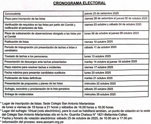 ElComité electoralde la AEXSAM, de conformidad con lo dispuesto en el DS 019-88-ED, el estatuto y el Reglamento electoralvigente del Comité Electoral de la AEXSAM,convocan a elecciones para la renovación de la Junta Directiva para el periodo de enero 2026 a Diciembre de 2027.